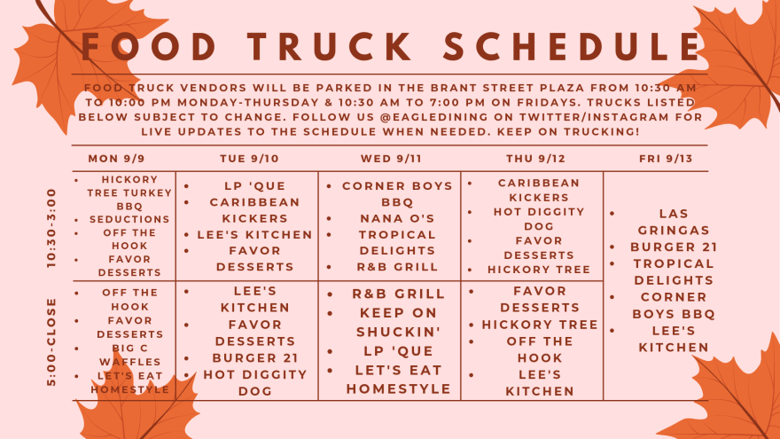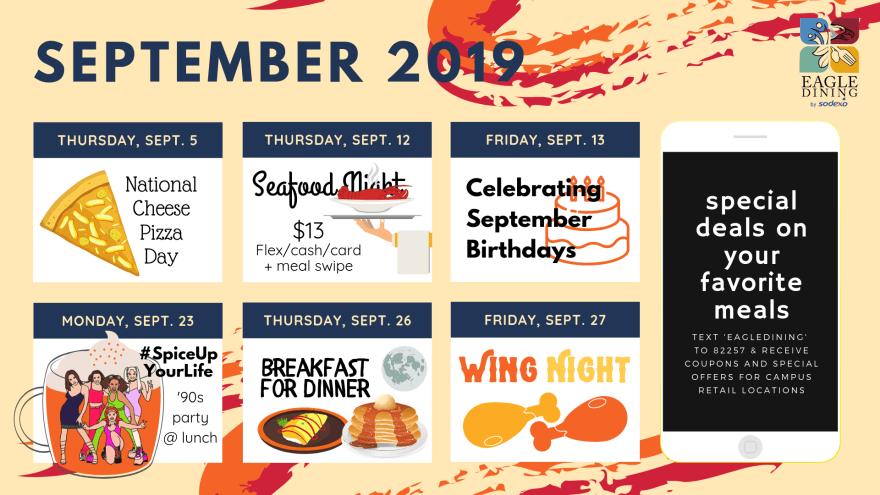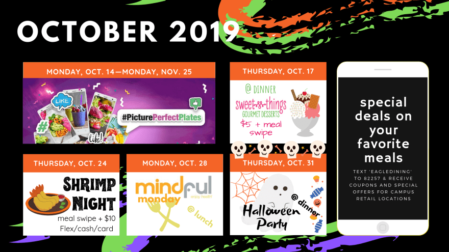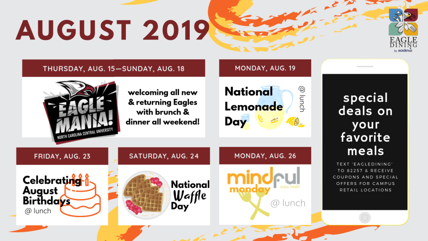 Eagle Dining Services (NCCU) Month at a Glance (/in Review) Newsletters Apr 2019Download May 2019Download Summer (Jul-Aug) 2019Download Sep 2019Download Oct 2019Download Social media posts (Canva) Standard/event signage (8×11″+) Event/Series Posters Schedules/calendars Other design work Related
